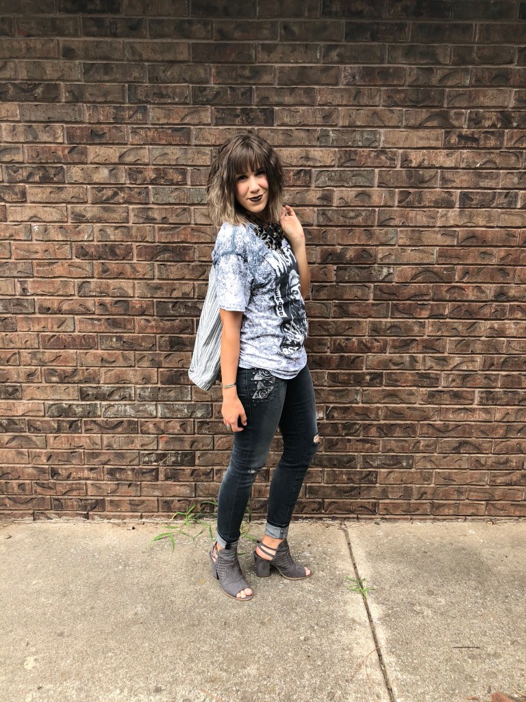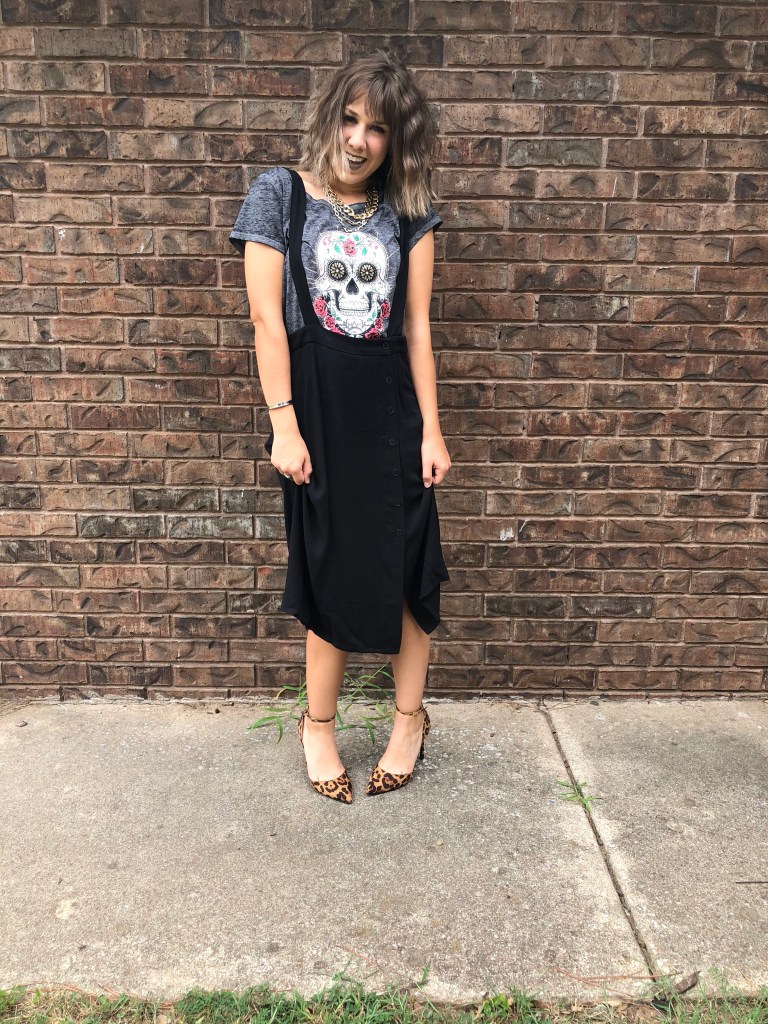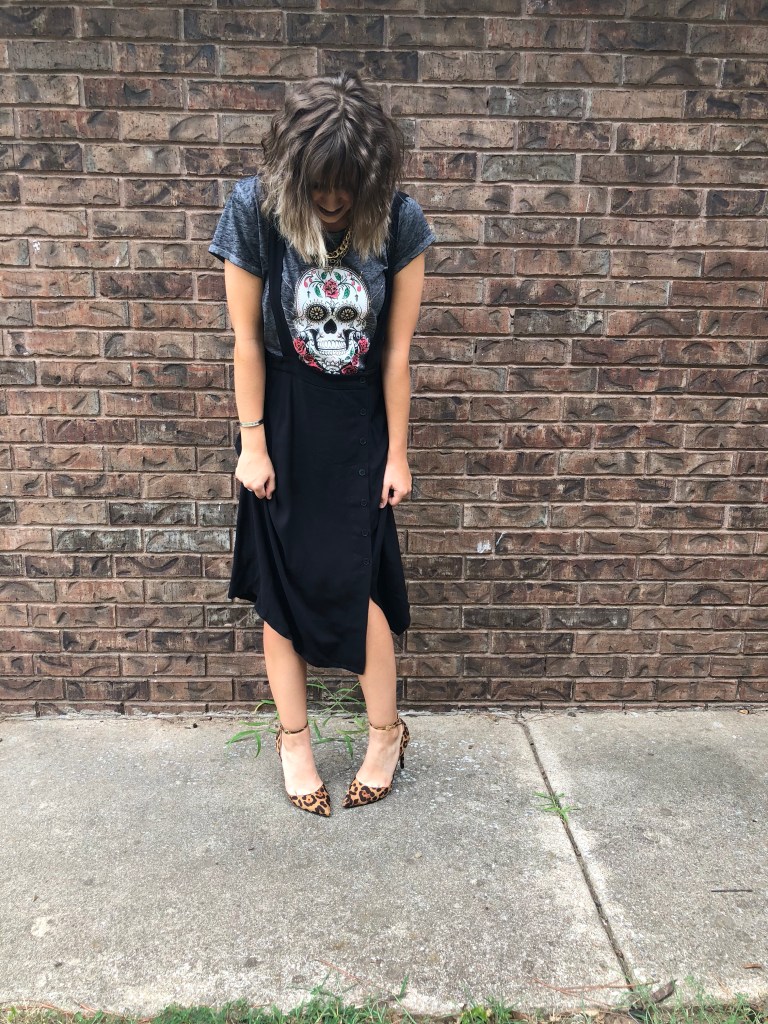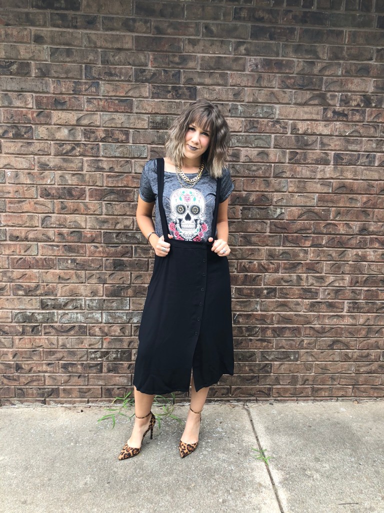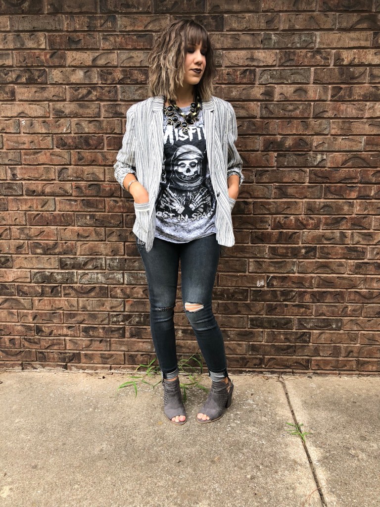 Sometimes you just gotta dress up a graphic tee! I love mixing casual pieces with something a bit more dressier to give outfits some edginess. That was my inspiration for the outfits below! Both of the tee shirts came from Walmart (the Misfits top I snagged in the men’ section and the sugar skull top was last year’s style around Halloween in the junior’s section – keep an eye out for some spooky graphic tees which should be trickling in stores shortly after the “Back to School” season).