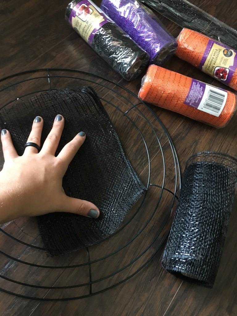 Same goes for the order you place each mesh strip – try to fill each section full for an extra fluffy and full wreath, but create your own order for colors. Mine was pretty random with the majority being black and orange with some pops of purple.