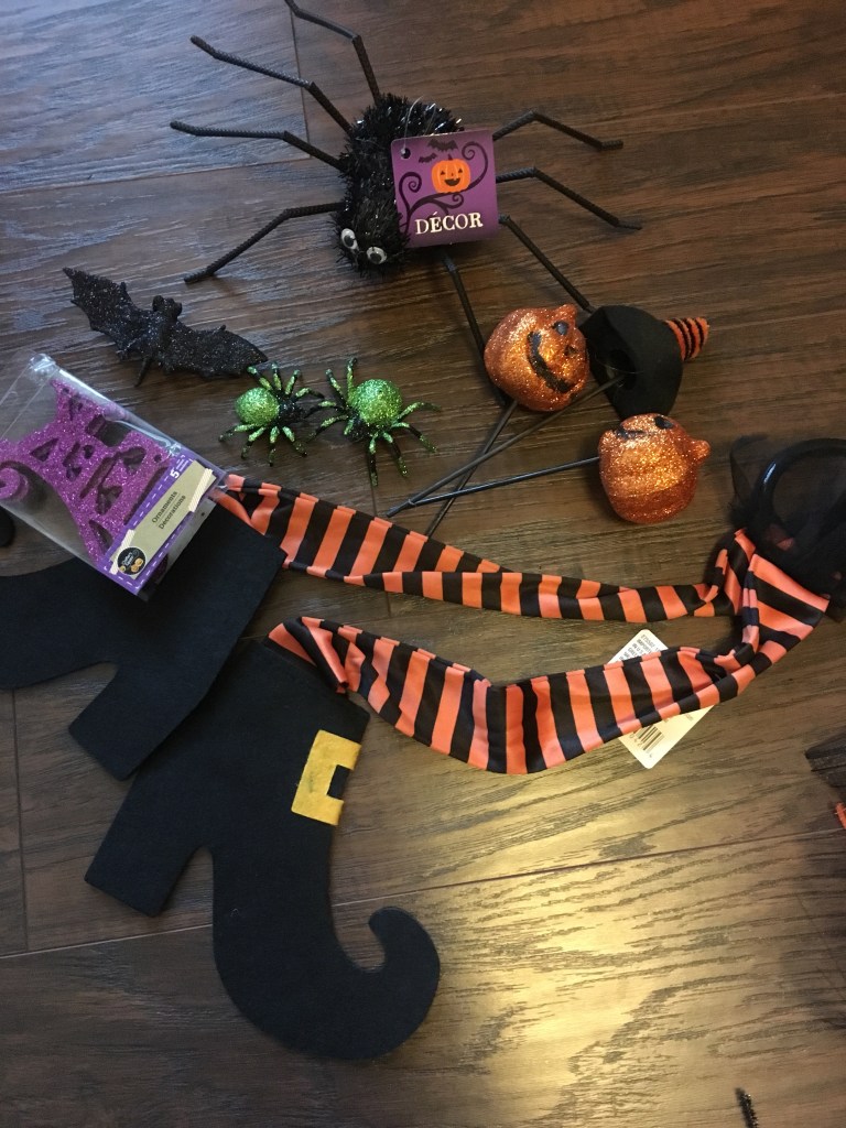 • OPTIONAL: Other decorative flare! I picked up some clip-on glitter bats, some decorative Halloween ornaments, glittery pumpkin stakes, some green spiders, a witch door hanger (I’m going to put the legs at the base of my wreath, and other odds and ends to incorporate – such as LED string lights!)