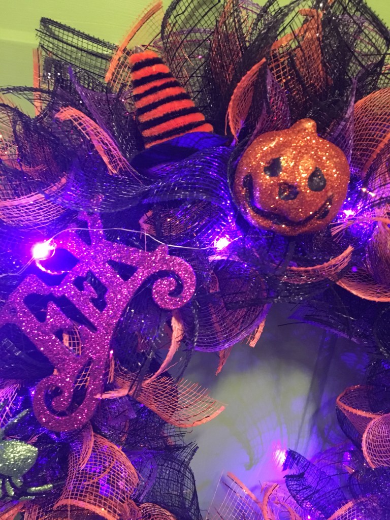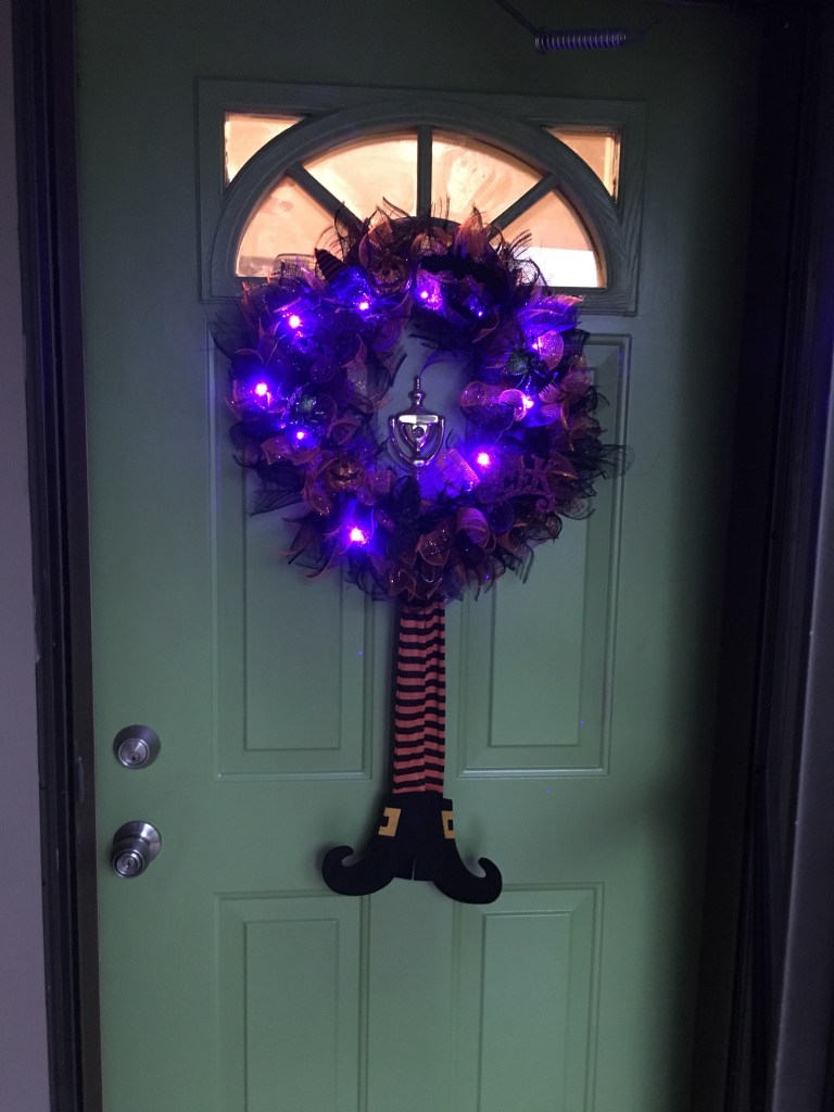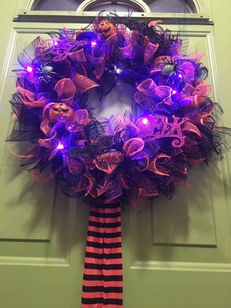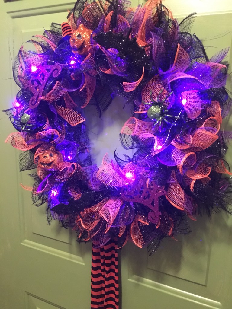 10. Too cute! Last year I made a wreath for someone for a wedding gift. It was a witch’s wire hat frame. The top section I used black mesh wrapped around and doubled over itself to give a folded layered look. The brim section I did the softer glittery type mesh with purple & black alternating. Added purple bat lights w/a small battery box attached at the back. Added hanging witch’s legs at the bottom. Added 4-5 different sized glittery spiders on the top section in a zig zag pattern. And slightly but gently bent the top section some to have a lean to the top. She loved it! I enjoyed making it!