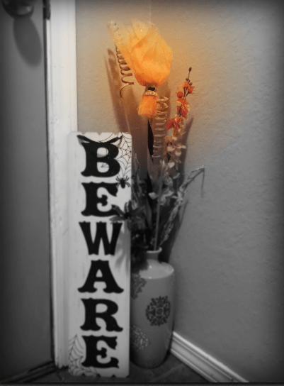 I used the large orange vases during my wedding five years ago. They are the perfect color for the season, plus they have a large enough opening to create a floral arrangement with the brooms. I picked up the “Beware” sign, brooms and floral stems all from the Dollar Tree (you’ll see that’s a trend with me because I love decorating on a budget!).