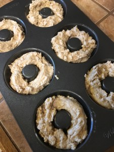 - The batter will be stickier compared to most baked donut recipes. With that said, you will have a trickier time piping them into the molds. I simply spoon the batter in and mold it around the dount ring in the pan.
