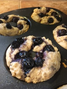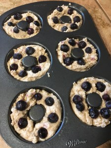 - Stir in some blueberries OR press them into the dough in the pans (I usually press mine in)