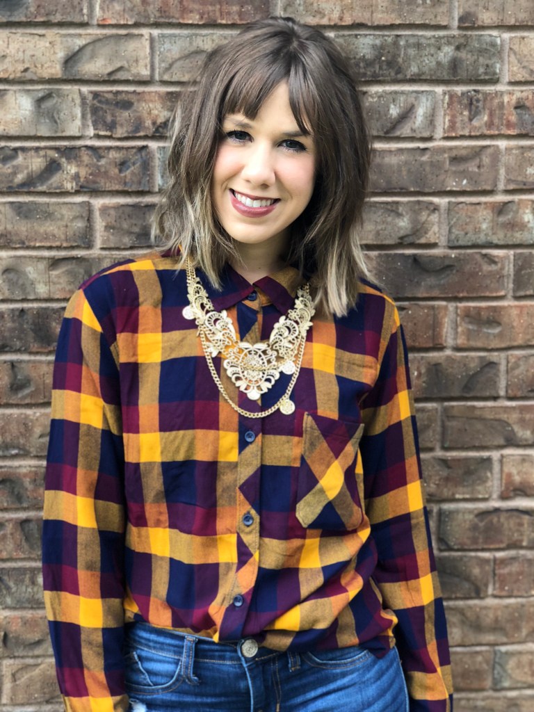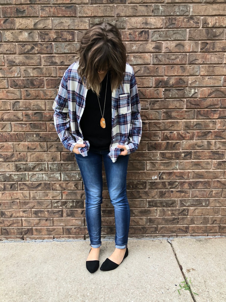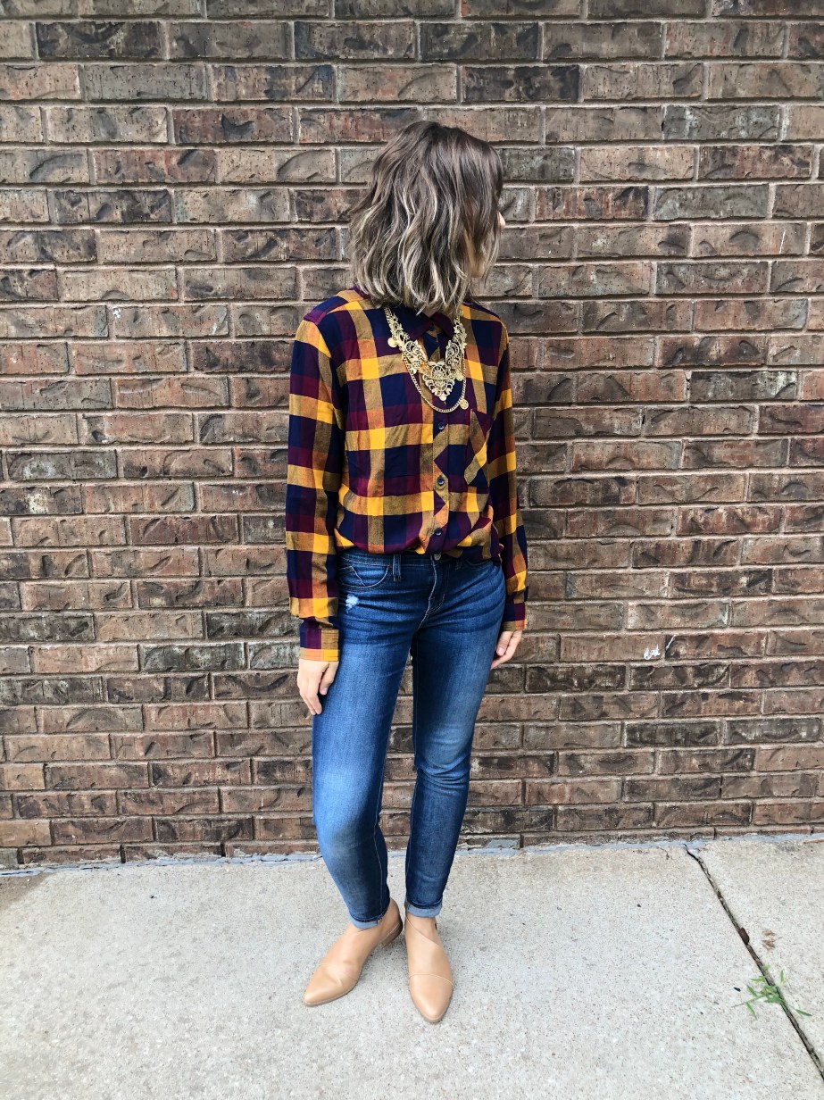 I am quite impressed with Walmart’s latest Time and True brand which is the brand of flannel top I’m sporting in the photo above and below. The colors were too beautiful to pass up and remind me of the purple and yellow hues of fall leaves. It appears that this top is available in stores only, so be sure to check out the styles available at your local Walmart. Not only is this flannel top incredibly comfortable, but it is $13.94 making it quite affordable to boot!