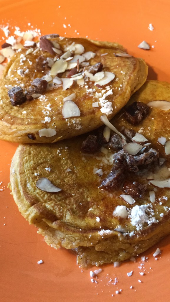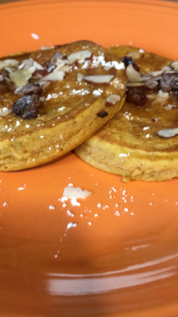 My favorite part is enjoying these fluffy and spicy fall treats! You can get creative with toppings – I think some fresh whipped cream and cinnamon would be delightful on top of these pancakes, but I opted for some powdered sugar, dates, sliced almonds and maple syrup. Delicious!