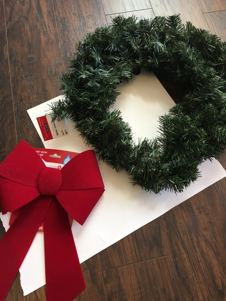 I got the wreath for $4 on sale at Michael’s but you can find a smaller wreath and accessories all at the Dollar Tree as well to make this less expensive.