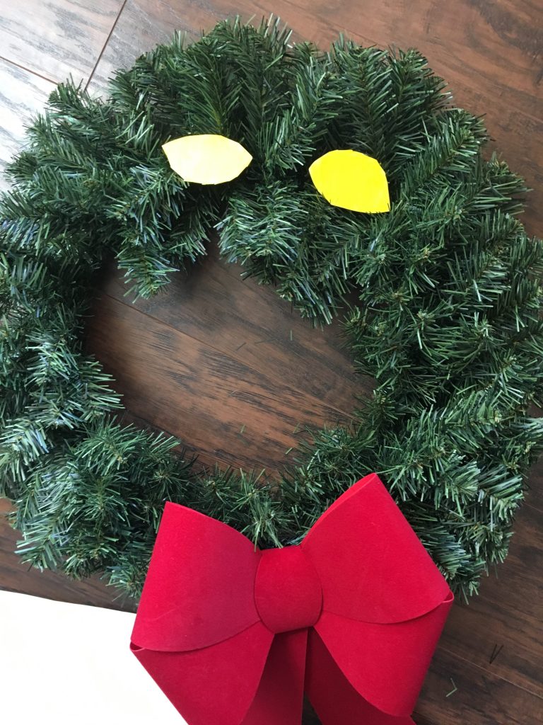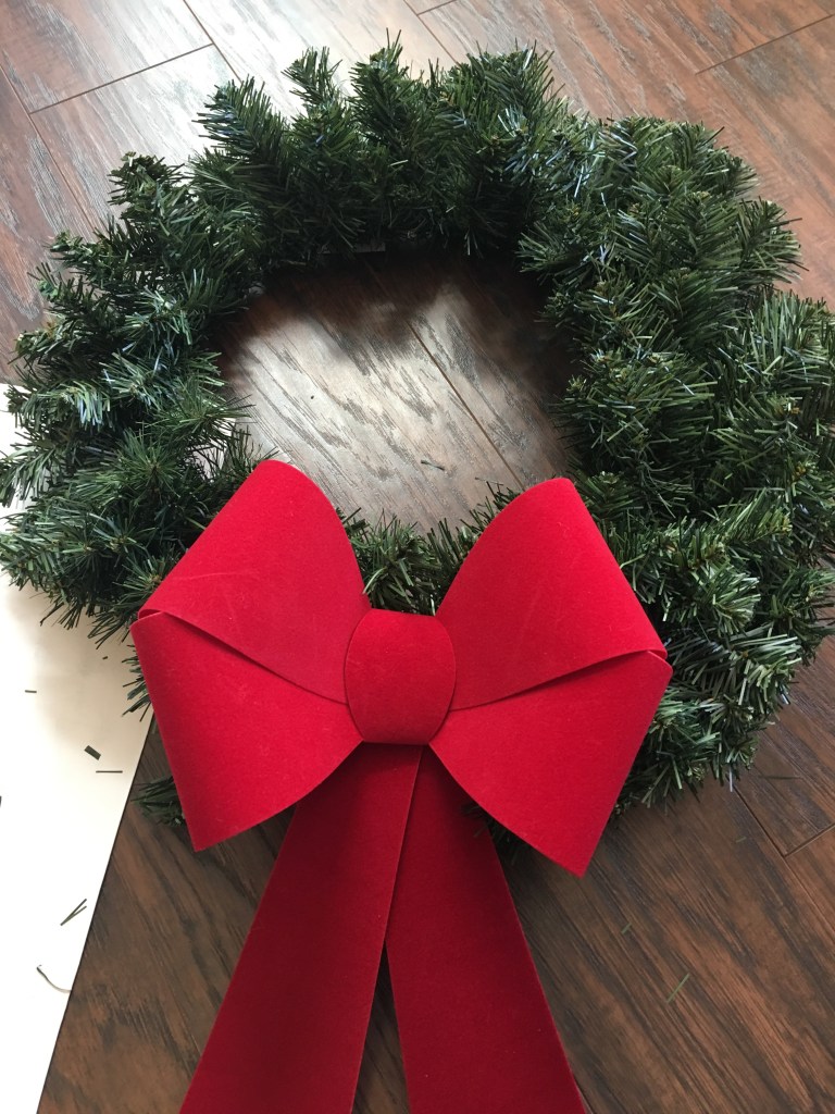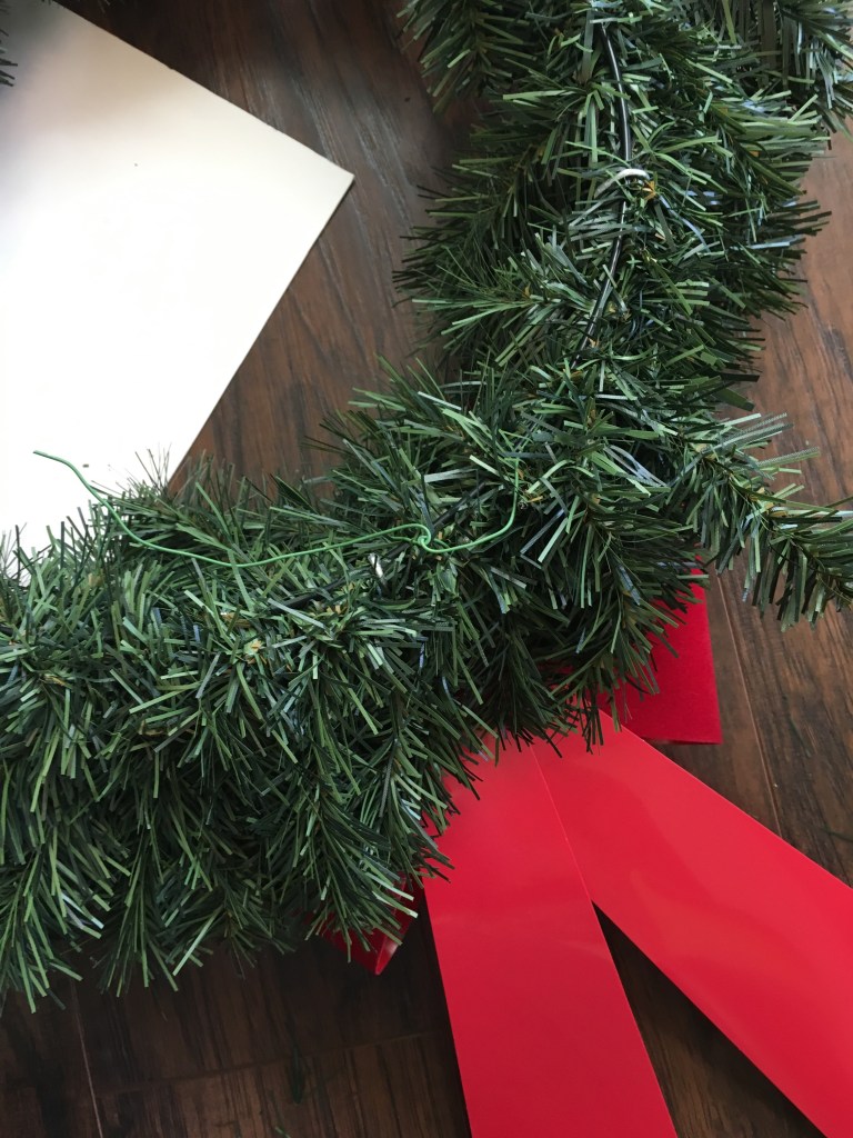 After that. secure the bow somewhere close to the middle of the bottom of your wreath (I do not have a good eye for this stuff but I think I got as close to center as I could!).