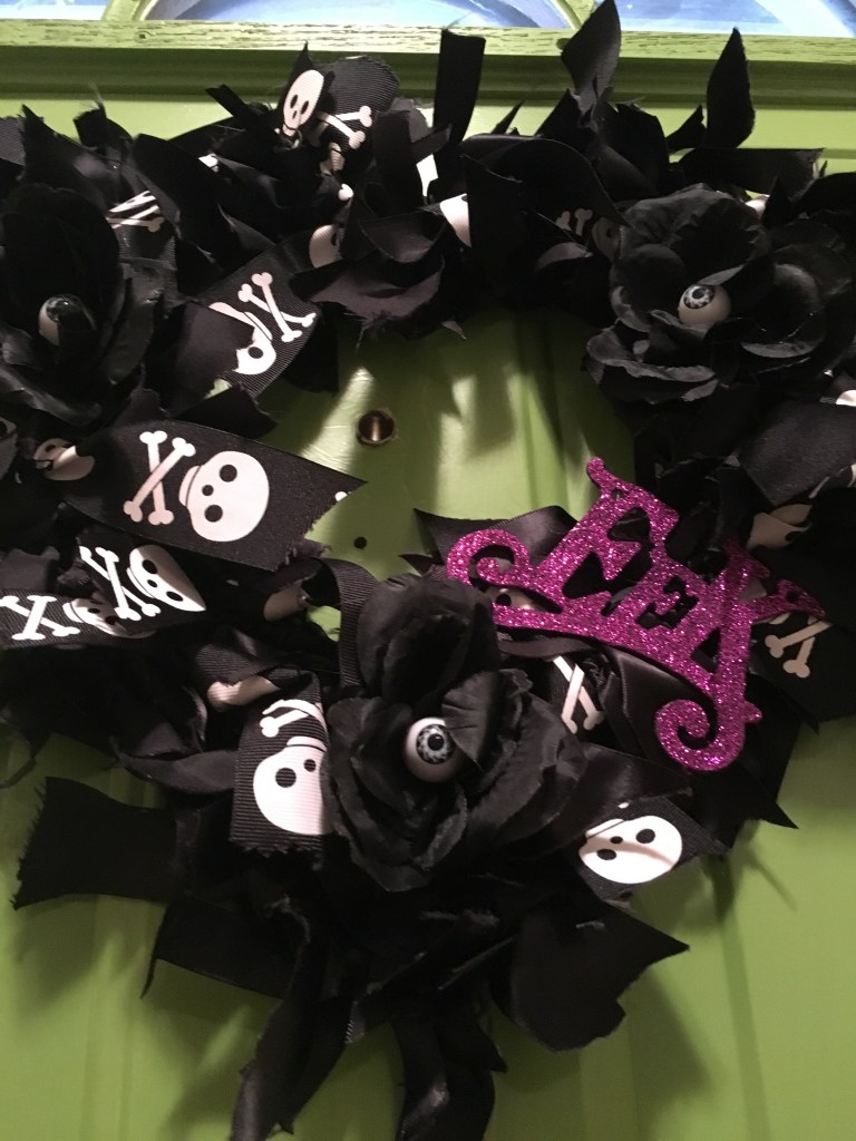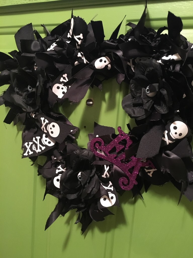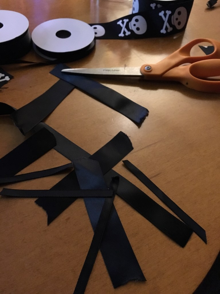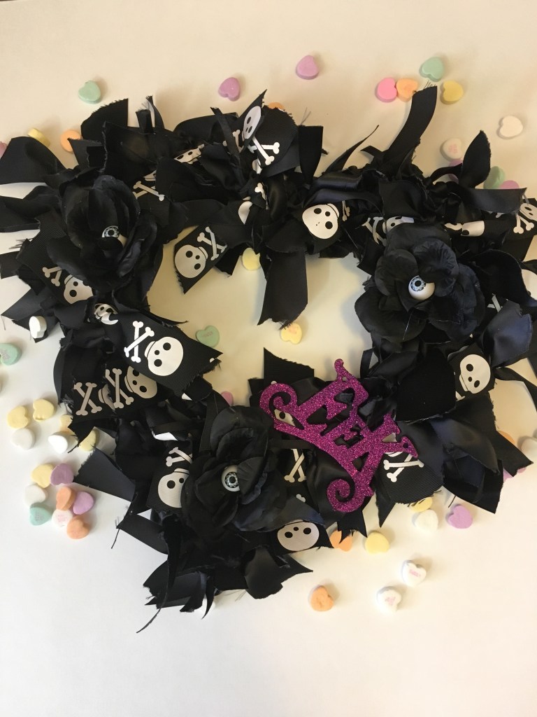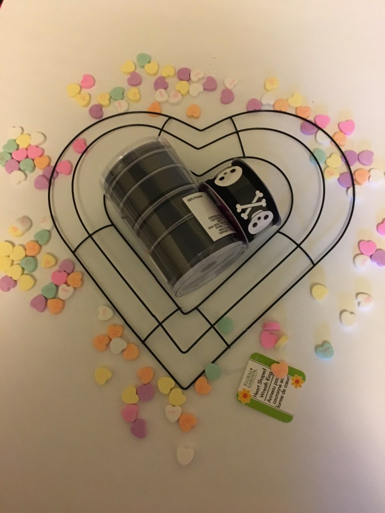 I found this perfect heart shaped wreath wire frame at my local Dollar Tree and grabbed some black ribbon from Michael’s (including a patterned spool with some skull and cross bone action on it!). I thought the variety of different sized ribbon would give my wreath a lot of texture, but you can use all the same size ribbon depending on the look you’d like to achieve.