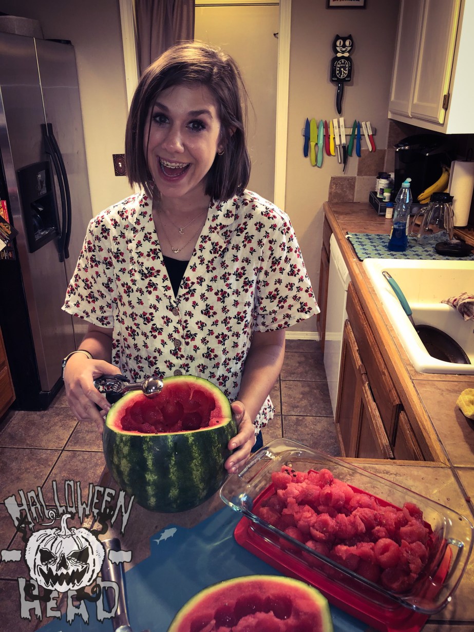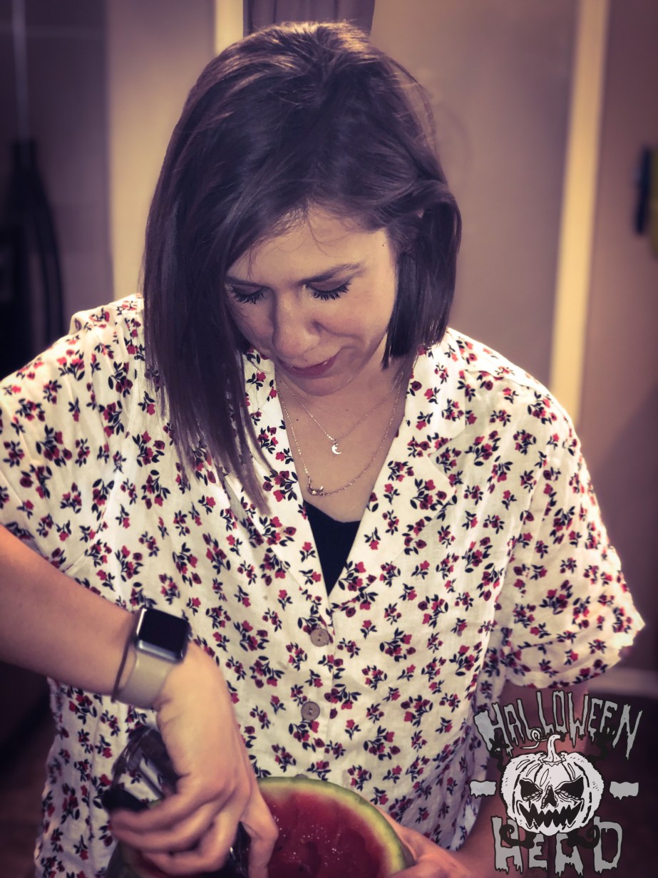 I tried my best to find the most round watermelon at the grocery store. I am also not good with knives or carving things in general…so as I attempted to cut a small section off the top, I ended up cutting it jagged giving my jack-o-melon a widow’s peak.