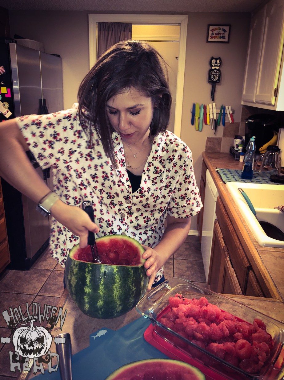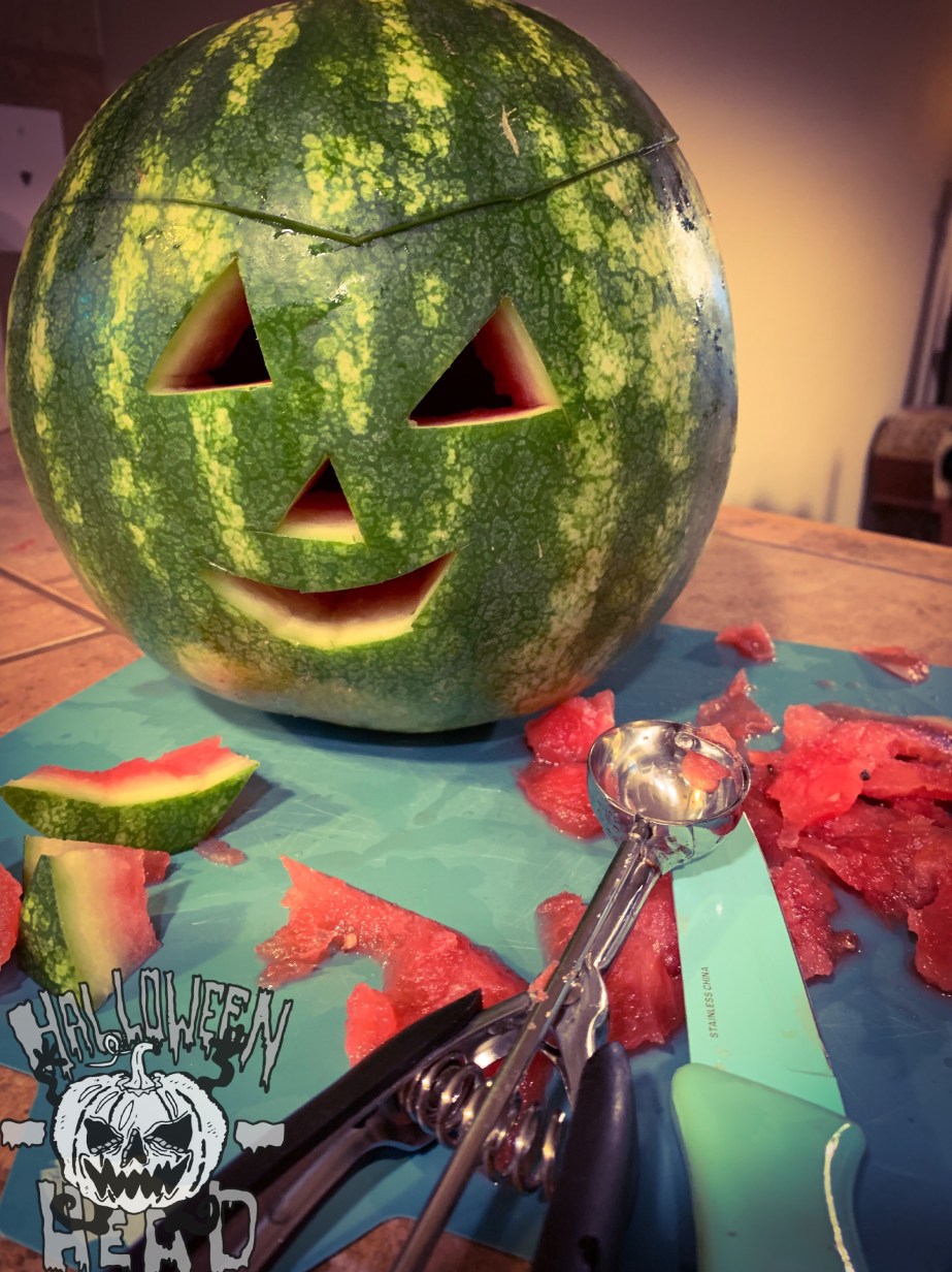 Once the melon meat in out, you can carve a face! Being the sloppy artist I am, I free handed my creation and I must say, it’s a lot easier to carve into a watermelon rind versus that of a pumpkin.