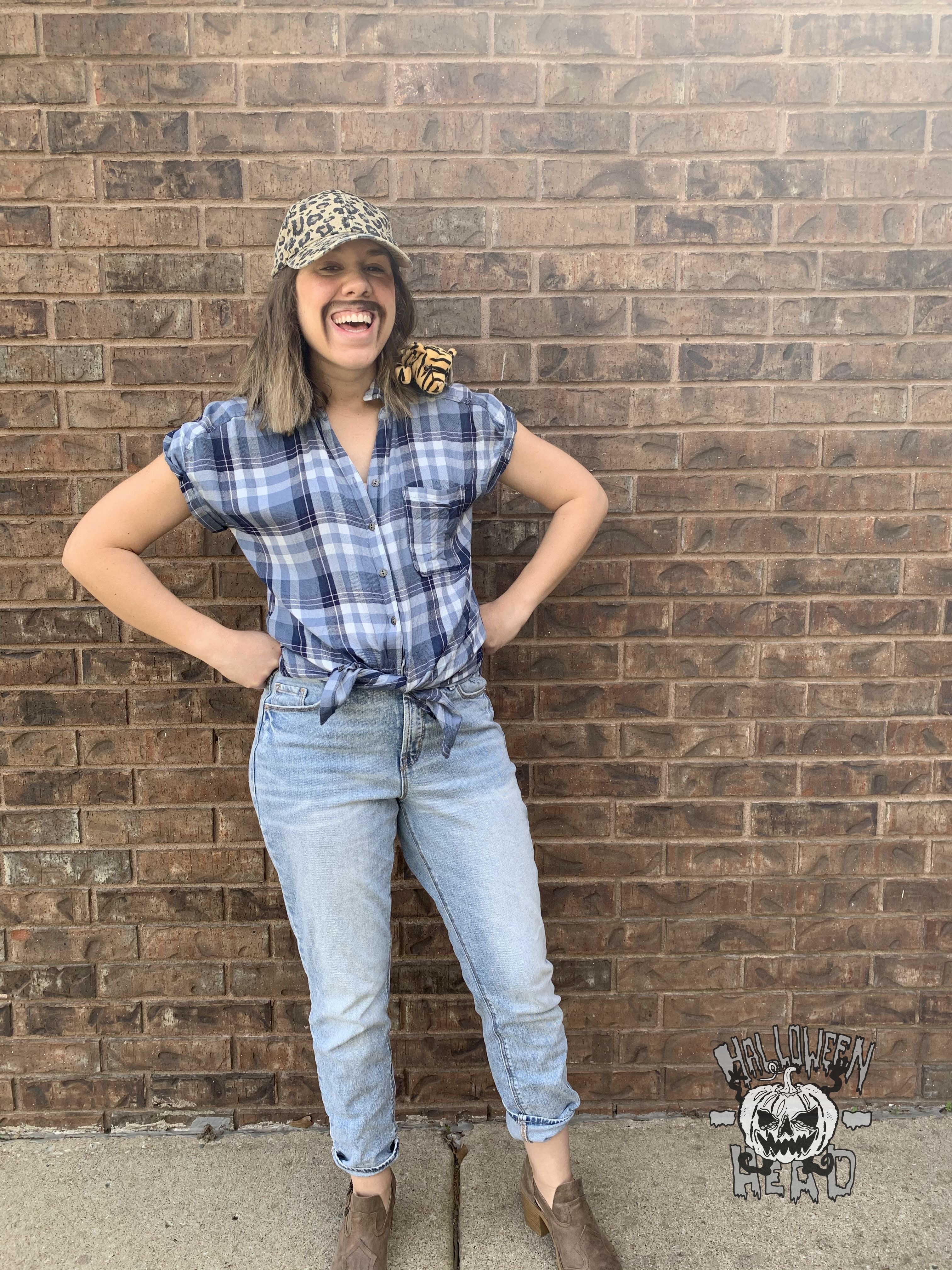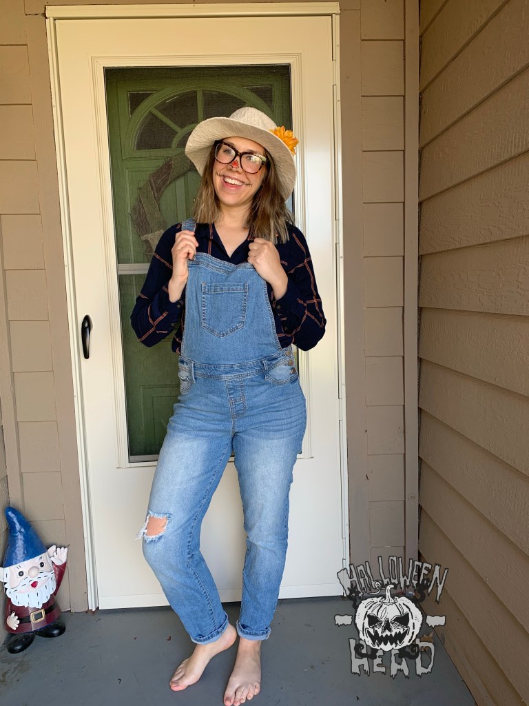 My favorite classic costume that is easy to create at home is a scarecrow! For this costume I layered my favorite overalls over a plaid shirt, added a woven hat and did a quick makeup job.