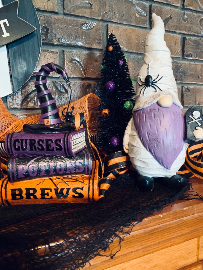On the other side of the mantel I placed our wise looking mummy gnome – he seemed like a good guardian of the “curses, potions and brews.”
