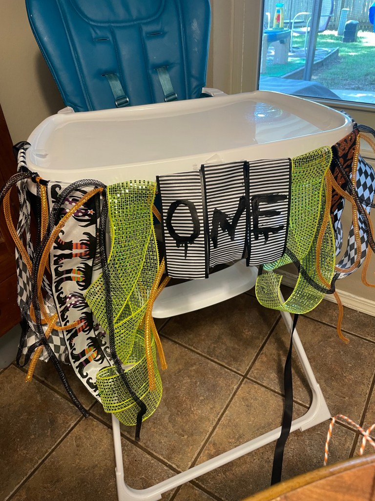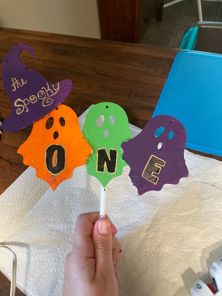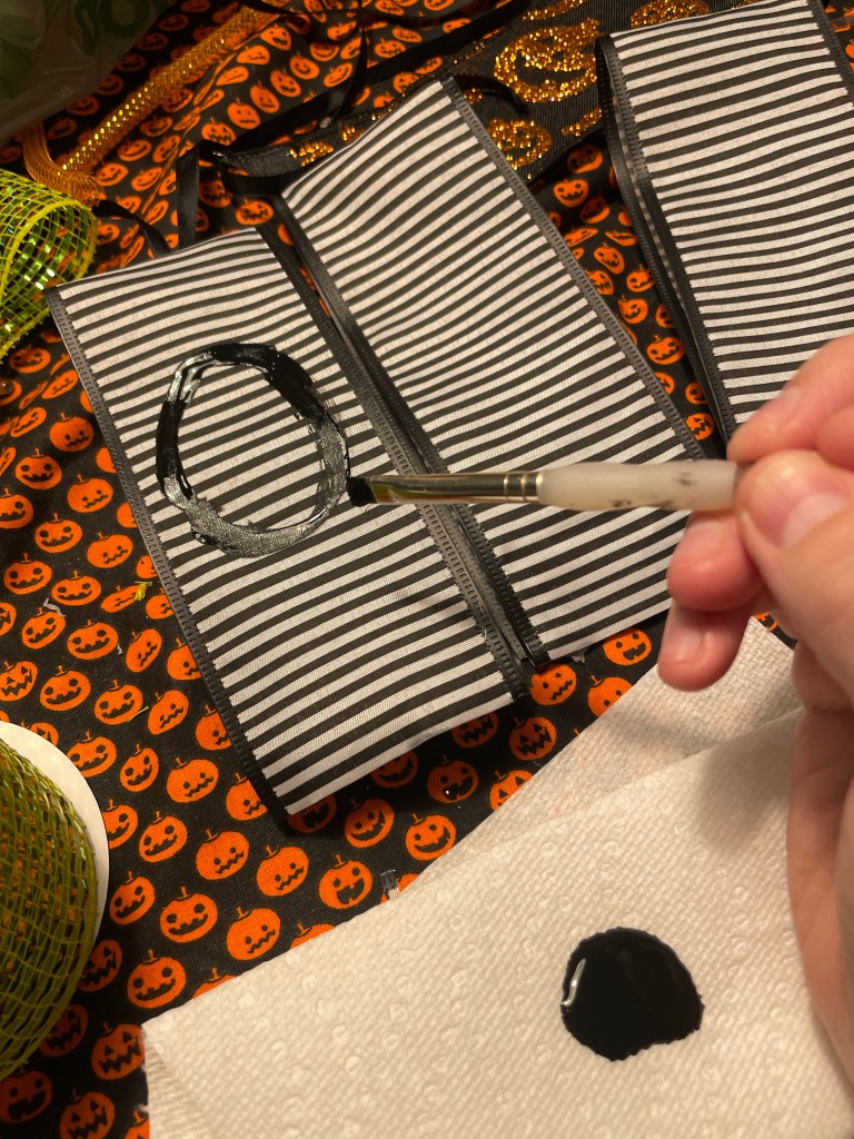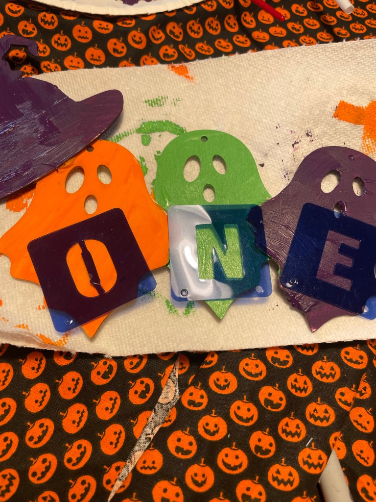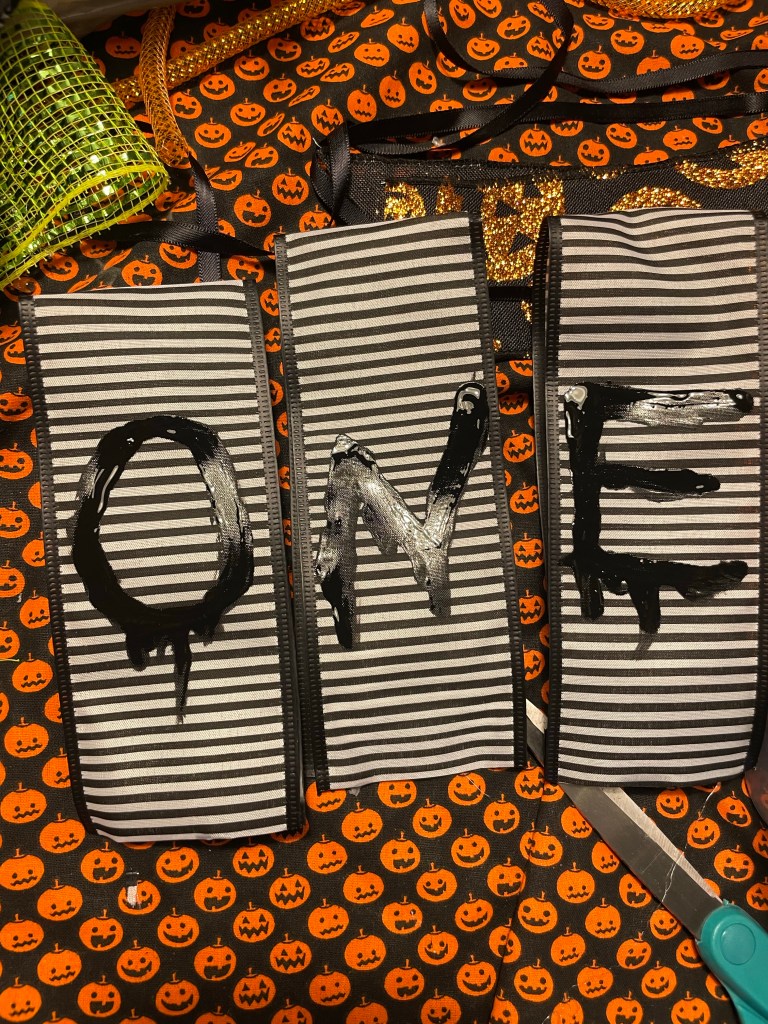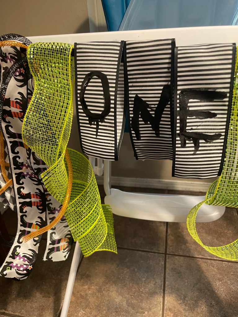 I cut some ribbon strips shorter to spell out the word “one” and free handed some eerie letters using acrylic paint.