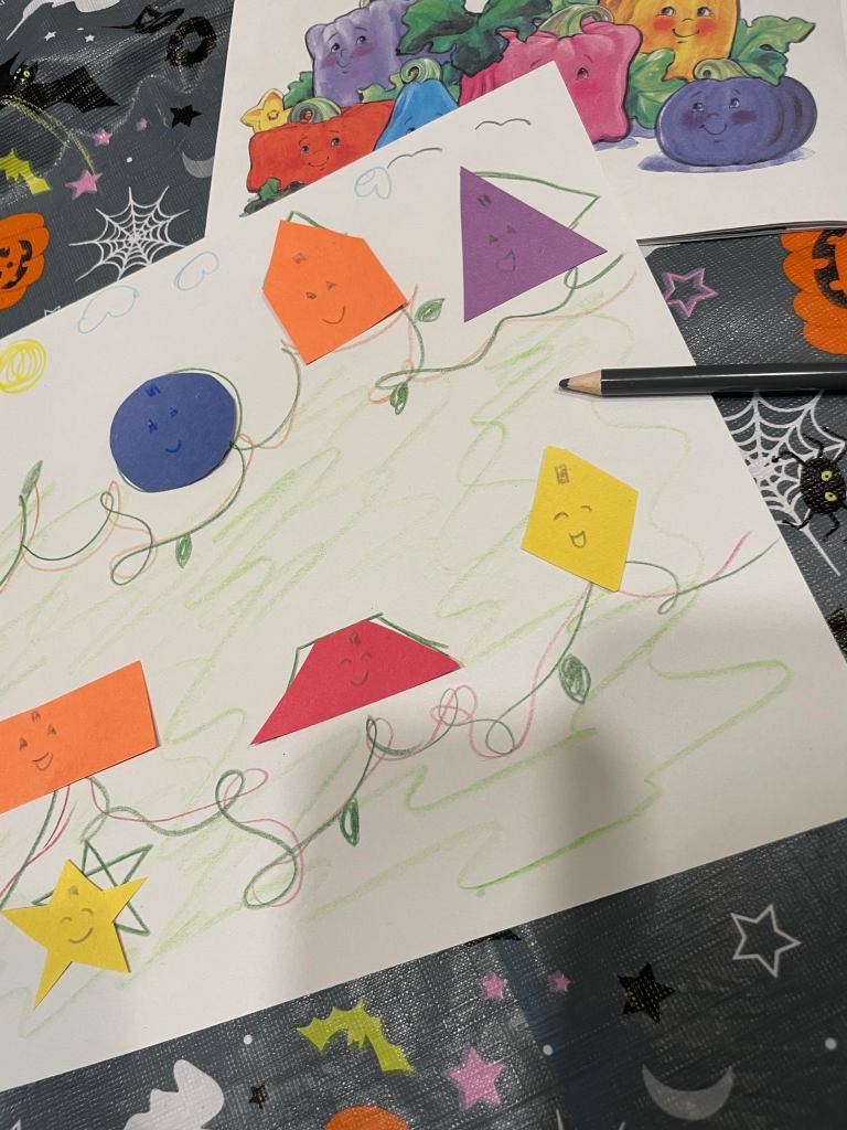 I simply drew a pumpkin patch with various shape outlines, and then created a colorful fun-shaped pumpkin on another piece of construction paper to be the “match” for my kiddo to place into the pumpkin patch.