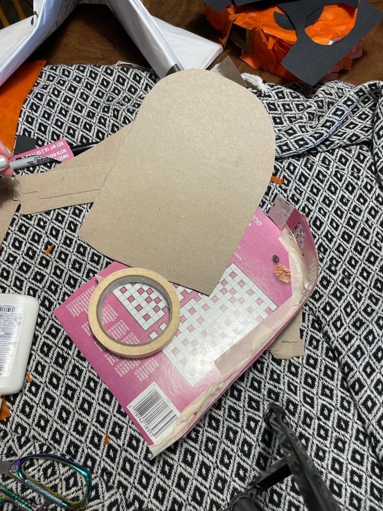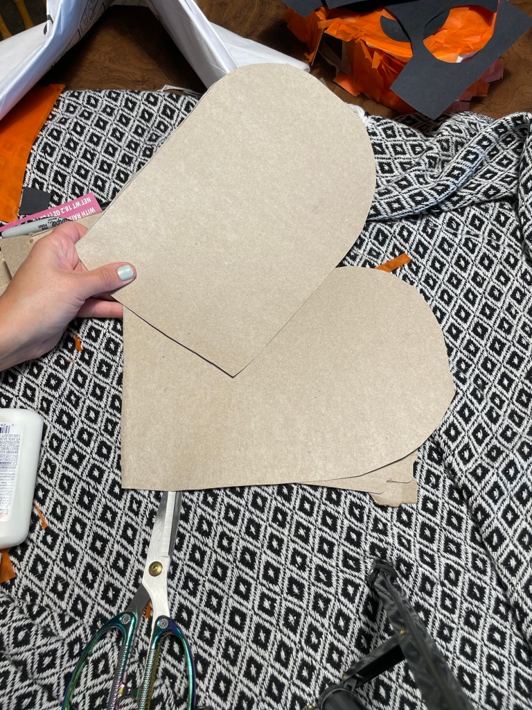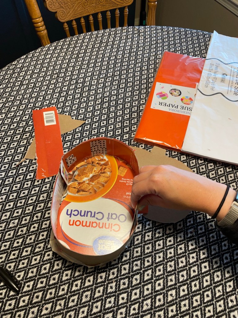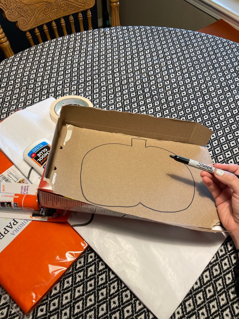 First step, is to decide what kind of spooky form you want to make! I chose to make a pumpkin and ghost piñata. I cut open the cereal boxes and traced two outlines (front and back) and be sure to save the sides of the box to trim out and seal up your piñata.
