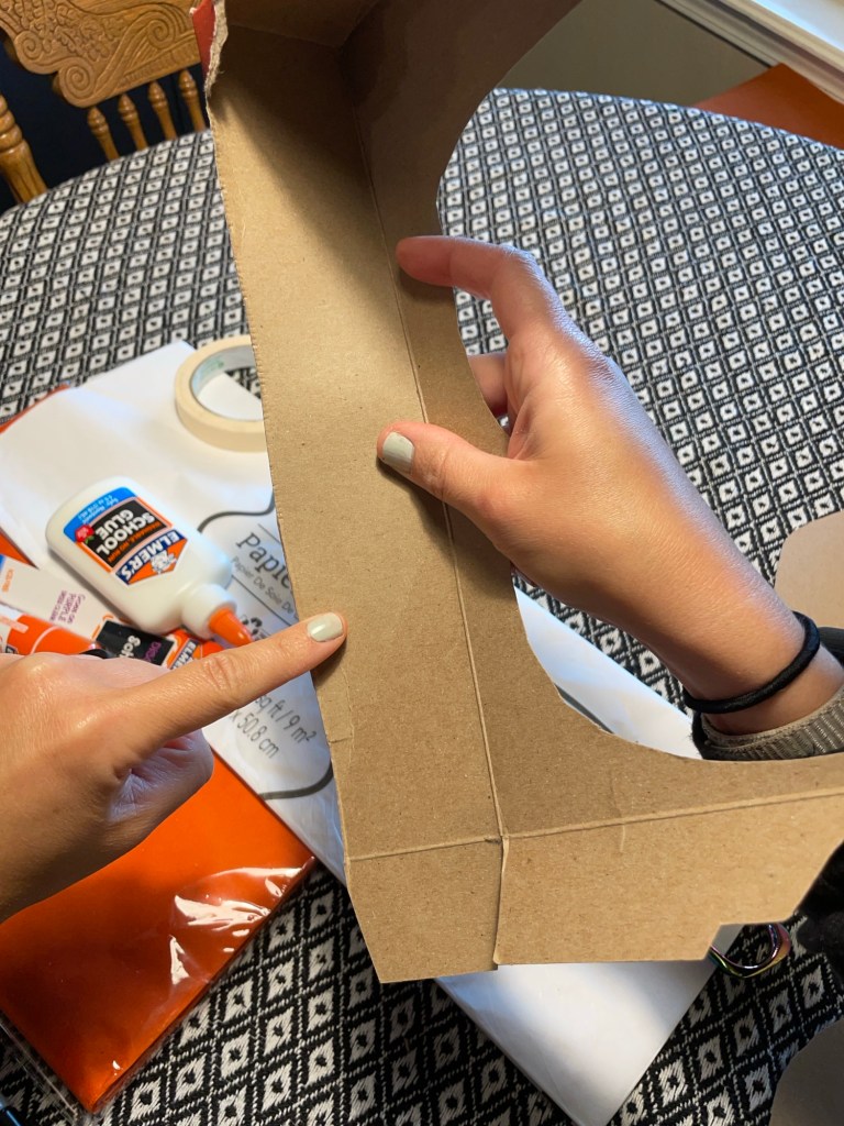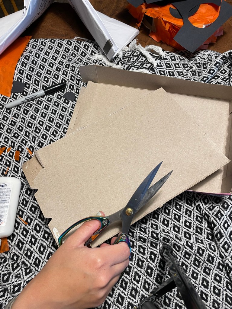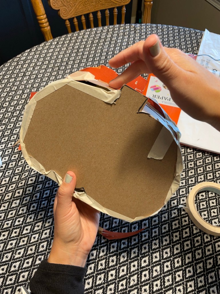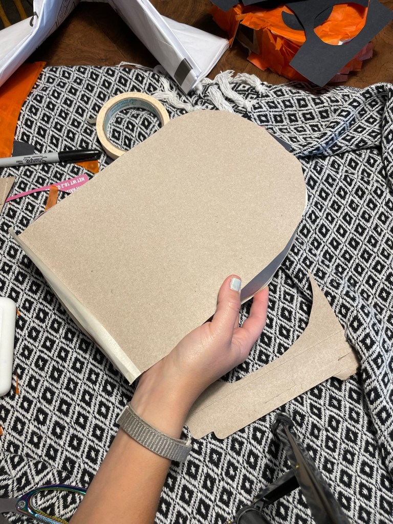 First step, is to decide what kind of spooky form you want to make! I chose to make a pumpkin and ghost piñata. I cut open the cereal boxes and traced two outlines (front and back) and be sure to save the sides of the box to trim out and seal up your piñata.