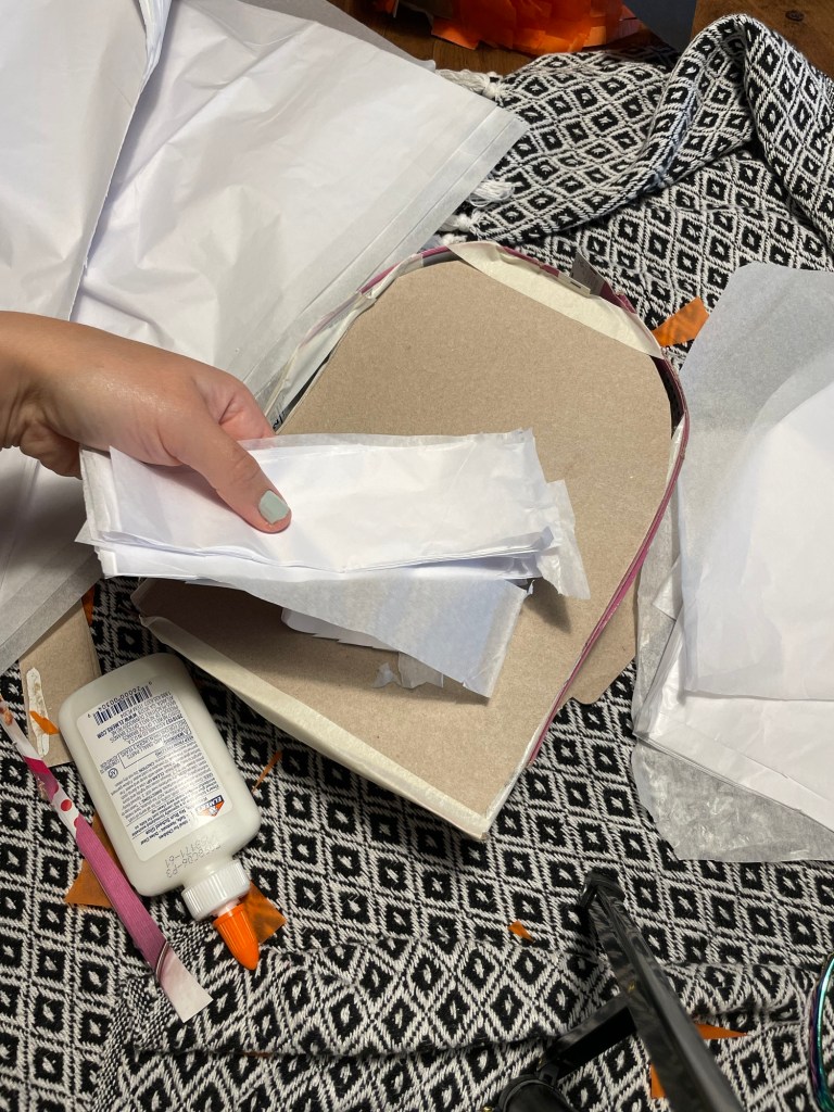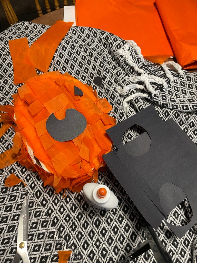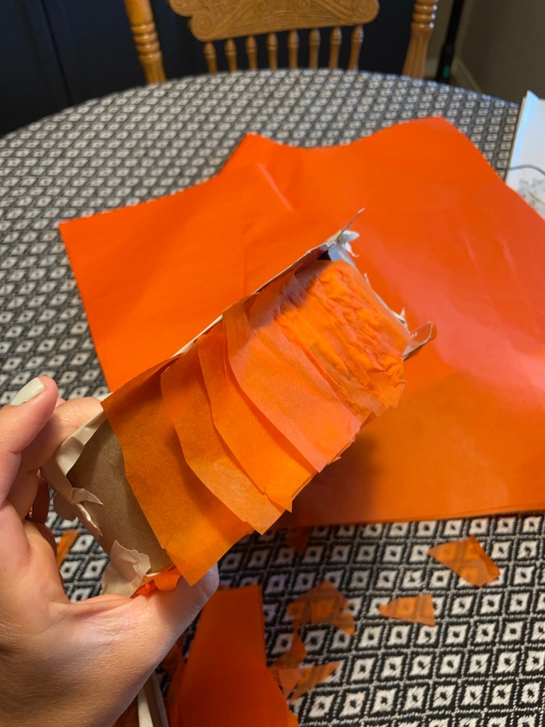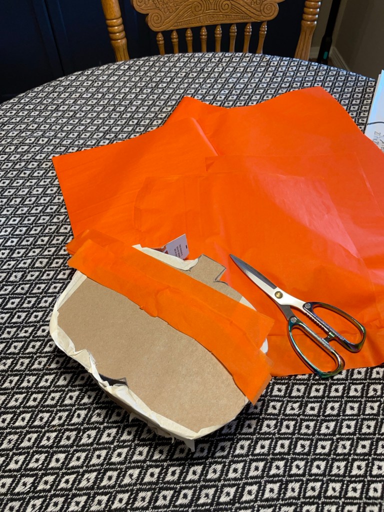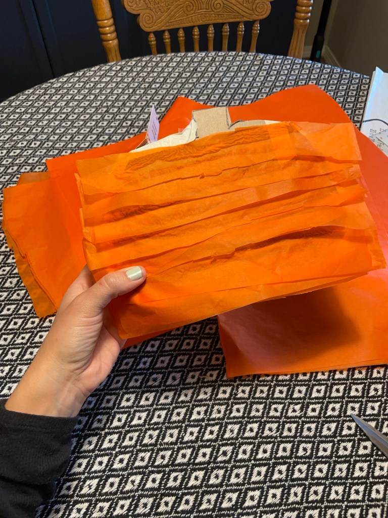I had to find orange tissue paper on Amazon because my Dollar Tree did not have any in stock, and I even looked for crepe paper (which can also be used if tissue paper isn’t desired for the the look you want to achieve or if it’s cheaper for ya).