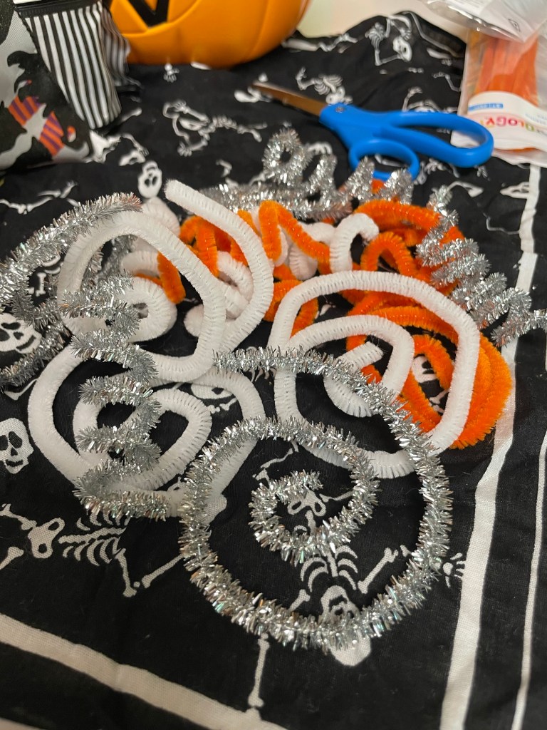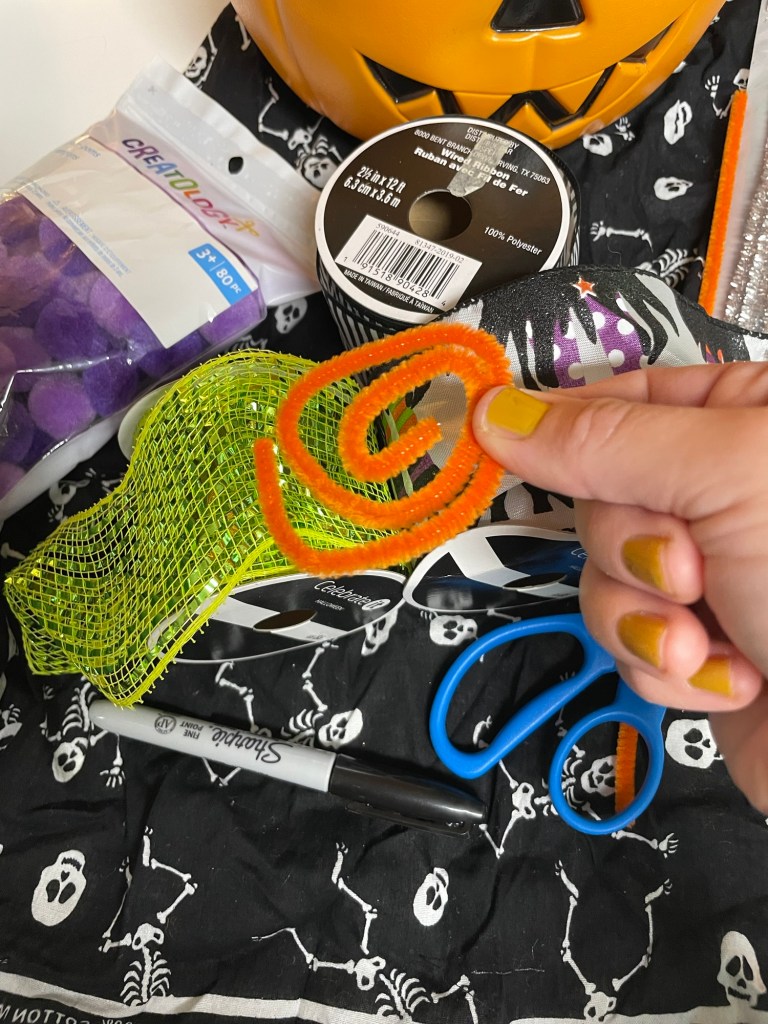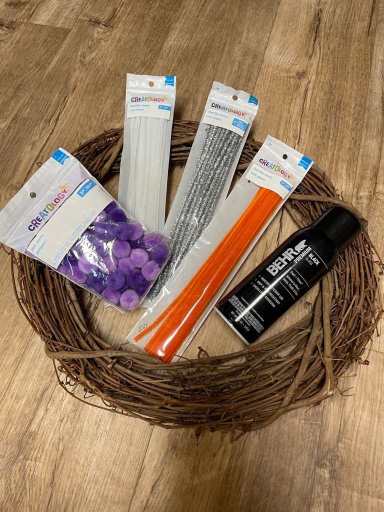 For this craft, I purchased a new grapevine wreath from Michael’s, some chenille stems and pom-poms. the first step was to use glossy black spray paint on the front and back of the wreath. You could get crazy and spray the base orange, ghoulish green, even purple!!! It all depends on the style you’d like to achieve.