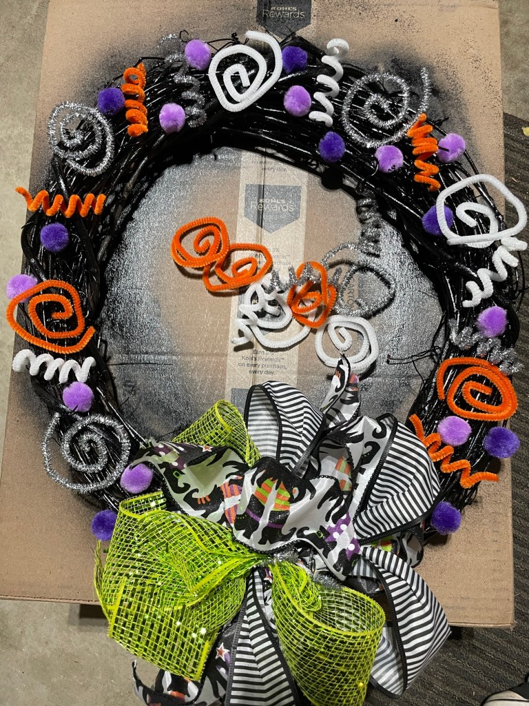 After it dried, I went back-and-forth on how I wanted to lay out my whimsical curls and swirls I made out of chenille stems – and I also debated on creating a large bow with leftover ribbon I had from previous crafts – but ultimately, I decided to go bow-less on this wreath.