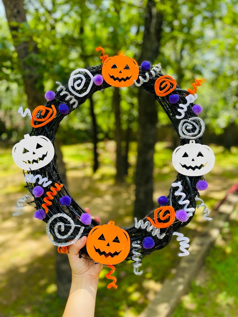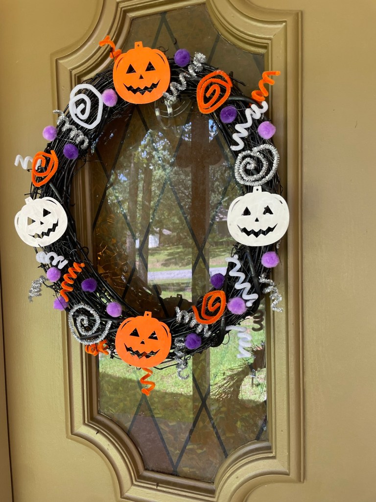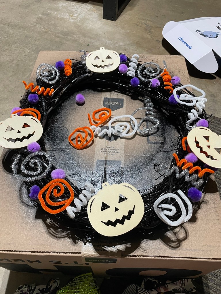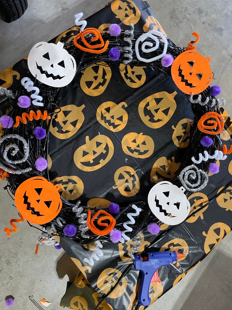 I used hot glue to adhere all the spirals, poms and wooden cutouts. I even added a few spirals popping out of the edges behind the wreath by twisting them into the vines. I may add some more because I love that Halloween-firework effect it was giving.