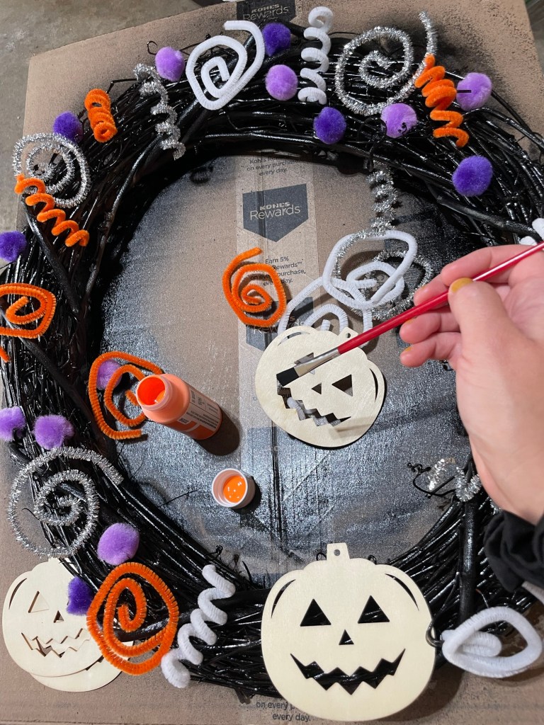 I found some old wooden jack-o-lantern cutouts in my craft supplies and thought they were just what this wreath needed to evoke the entirety of the Halloween spirit!