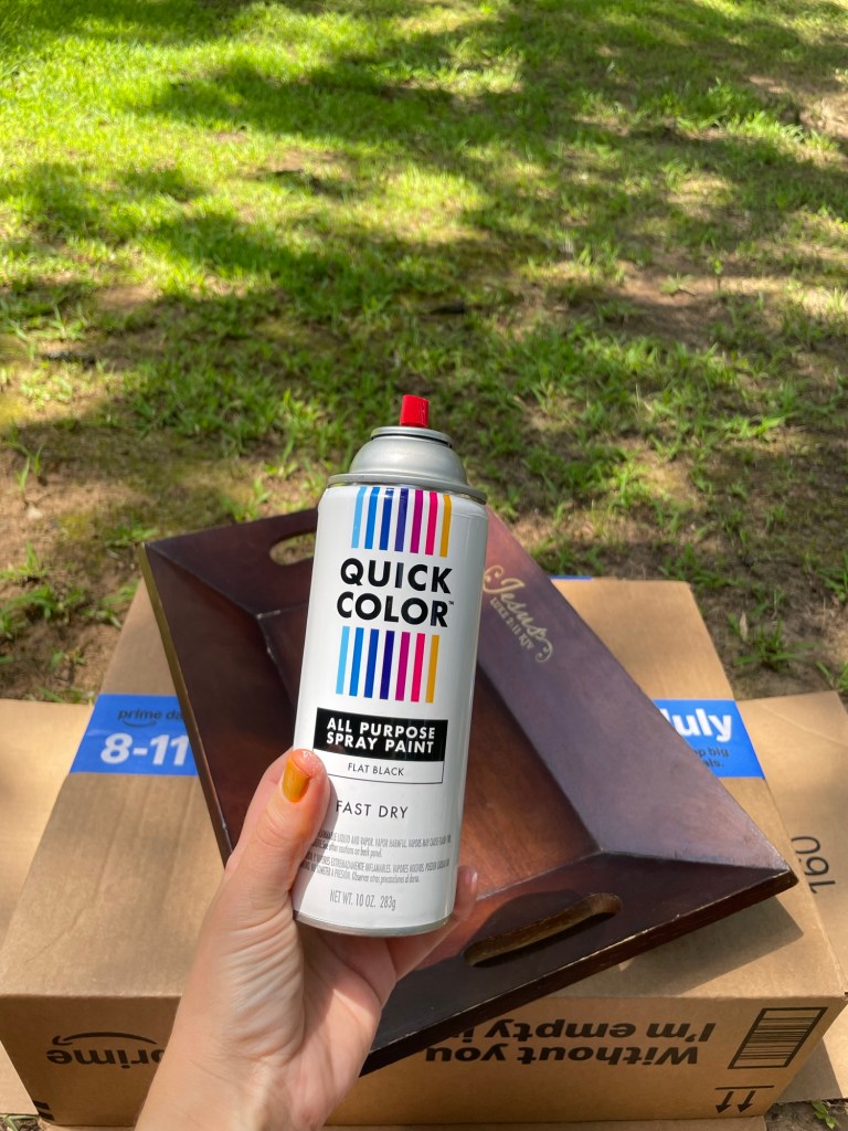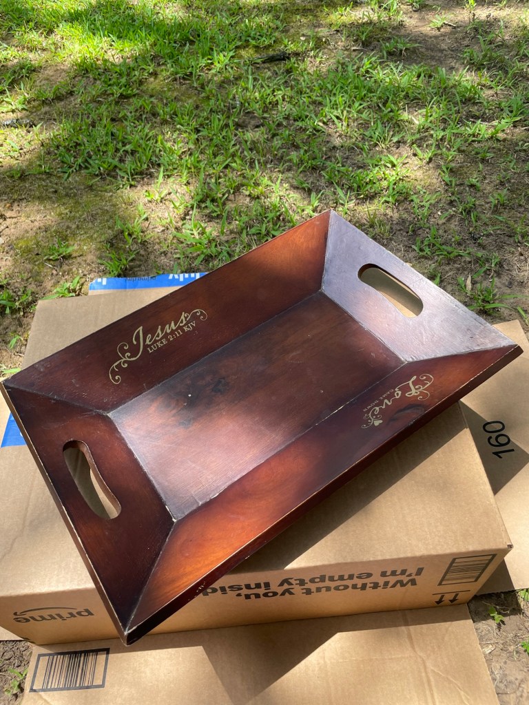 I started looking at the thrift stores for a wooden decorative tray and stumbled on this solid one for $2.99. Once I obtained this tray, I had a wild day and locked my keys in my car. Luckily, I was a few miles away from home but not so lucky – I might’ve been the source of two minor car accidents while I summoned a rescue mission. No one was hurt! I ended up calling my parents and asked them to grab my spare key and drive it over (my folks live a street over from my house). In the process, my mom accidently backed into my dad’s truck that was parked in their driveway causing both vehicles to succumb to a rumpled fate.