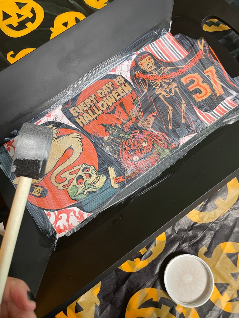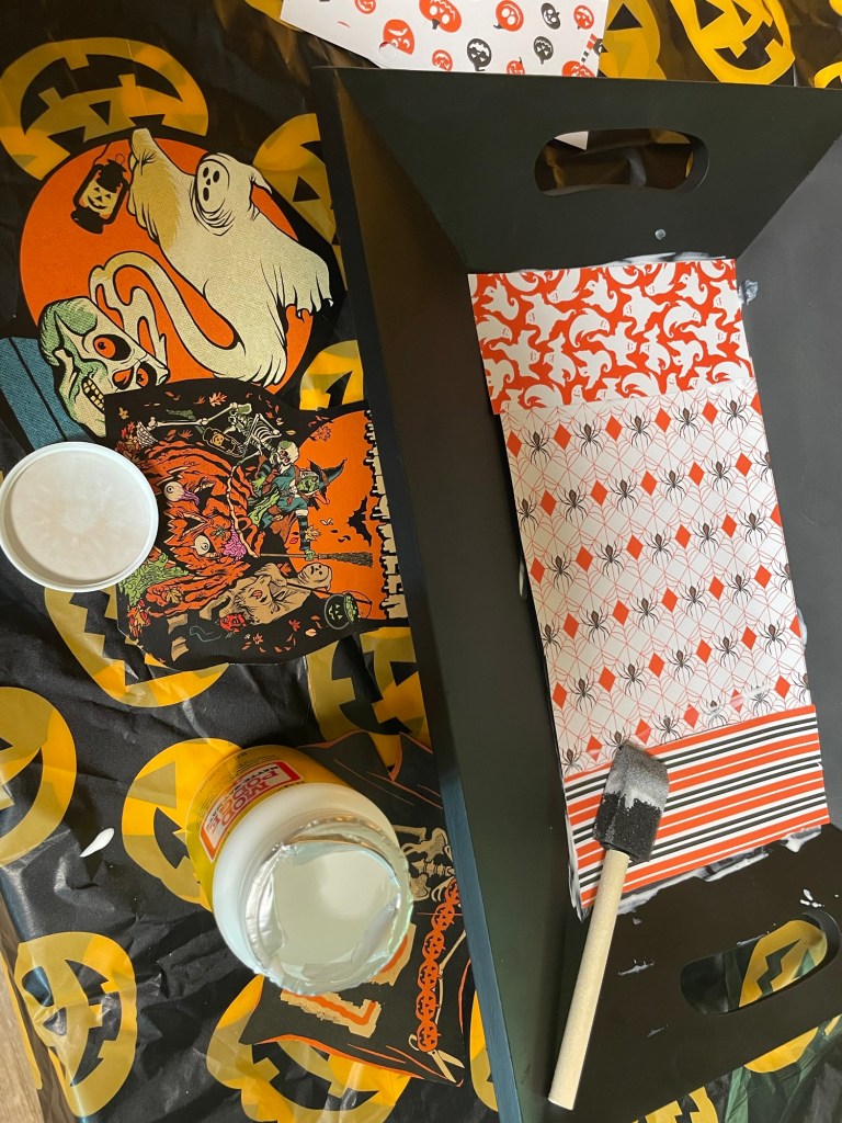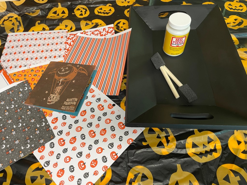I originally was thinking I would make a Halloween mosaic serving tray this year, but I have two preschoolers and I knew I wouldn’t have the time nor energy to truly make that a reality – but an easy mod podge collage seemed more practical (and just as cool!).