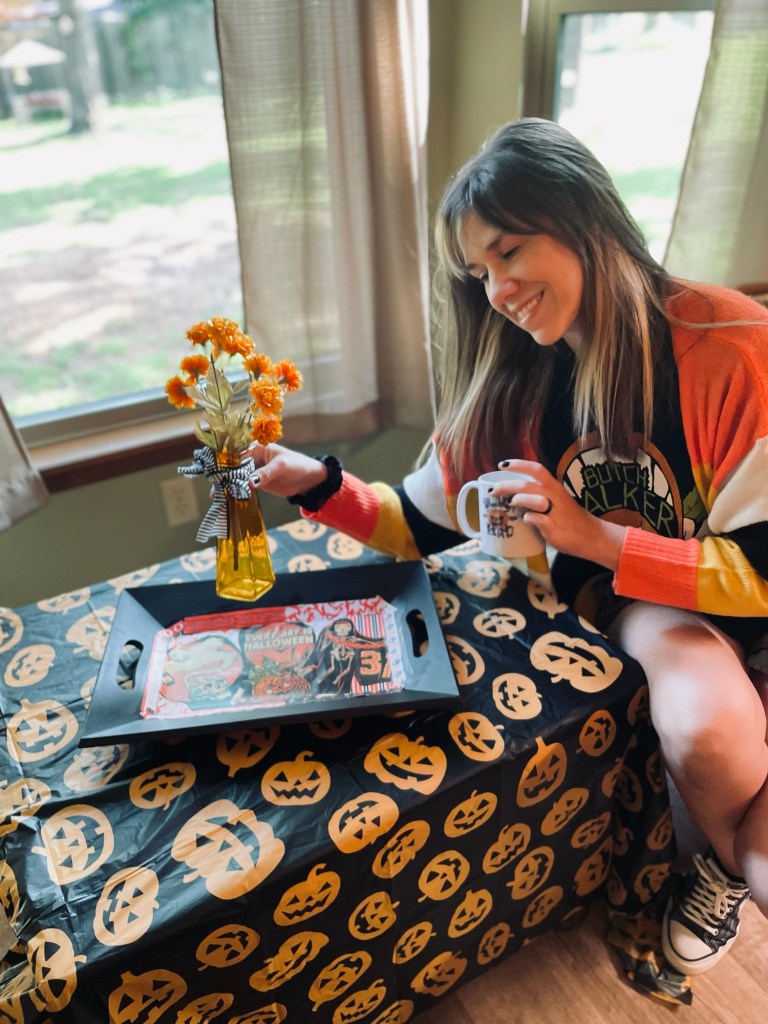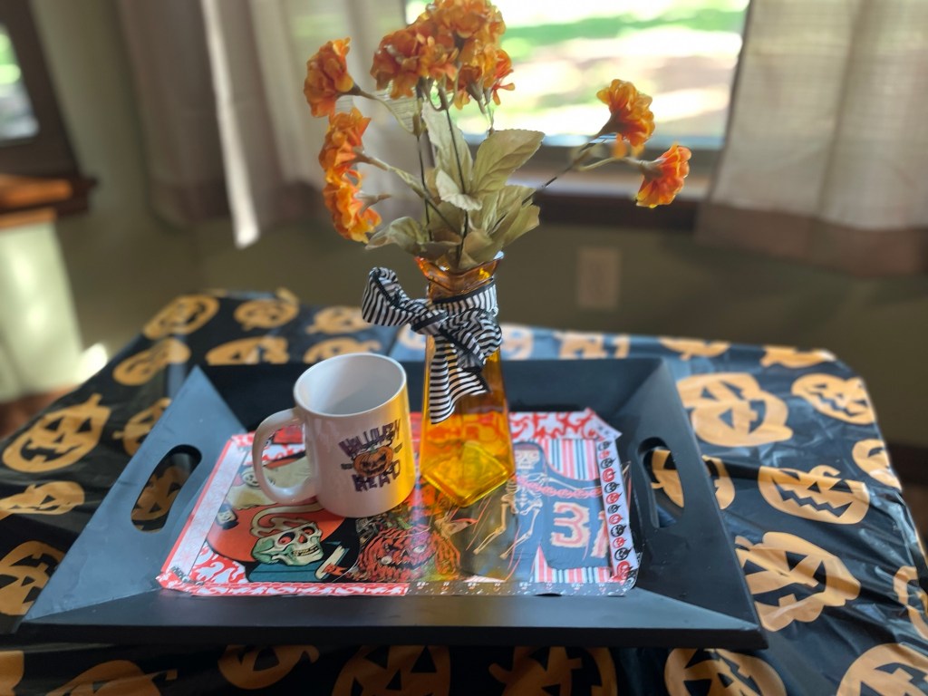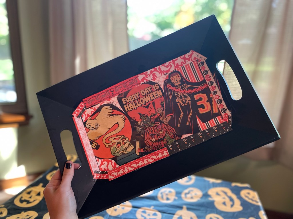 If you have some cool Halloween paper, cards, posters, etc you’ve always wanted to share and display – a decorative serving tray might also be the answer to your decorating needs as well!