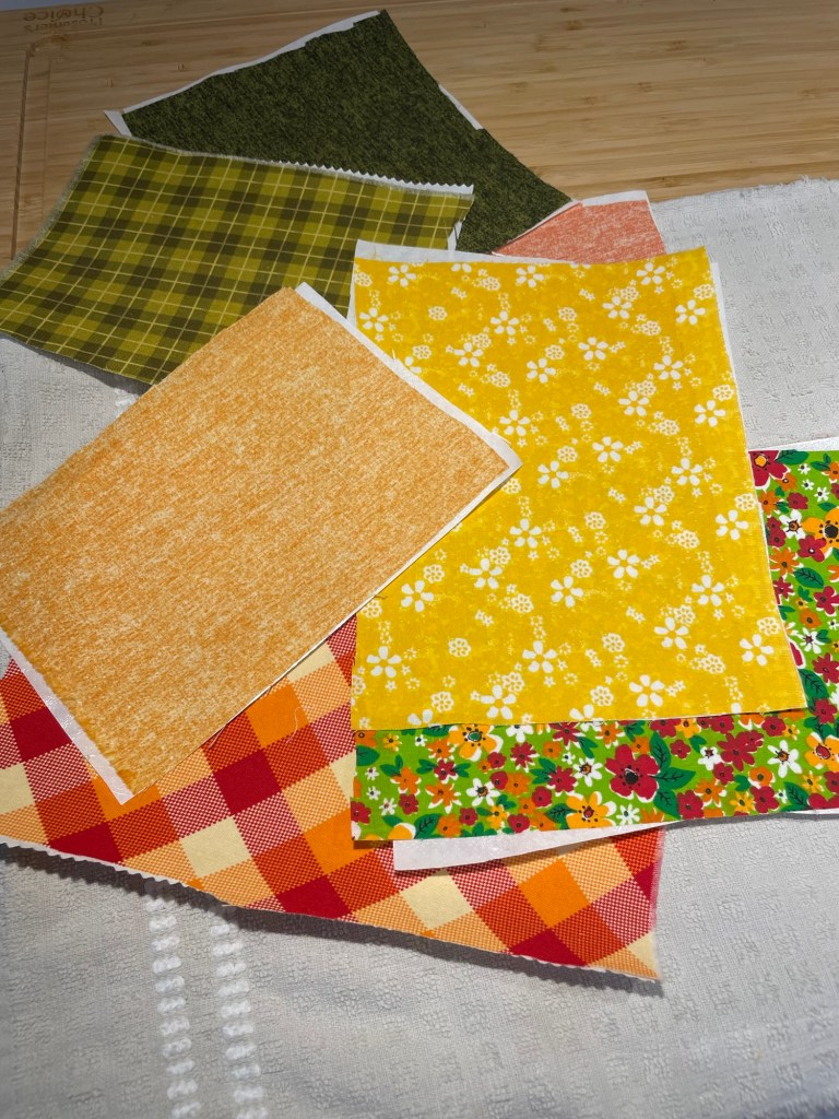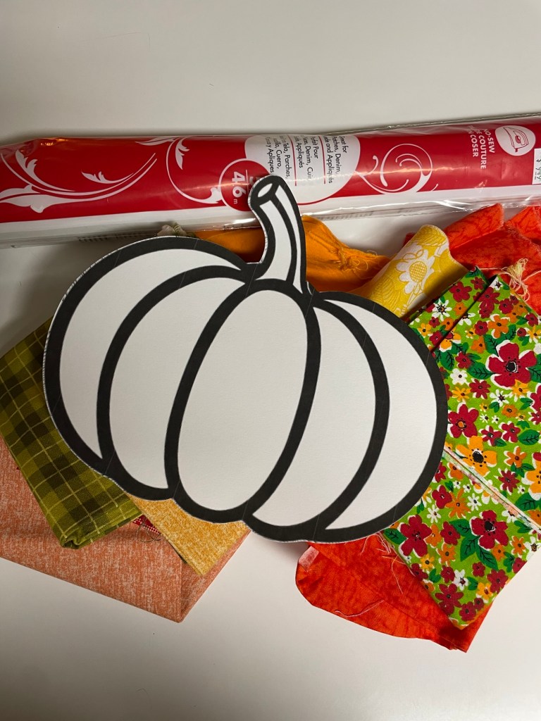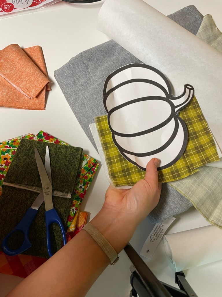 Once I had my template ready, I chose the fabric I wanted to use in each pumpkin section. I made sure I cut rectangles of fabric pieces and adhesive out that matched so that I could iron on the first layer of backing before I cut out the actual pumpkin pieces. Be sure to iron on the adhesive with the paper side on your hot iron and the rough plastic side on your fabric rectangle/square.