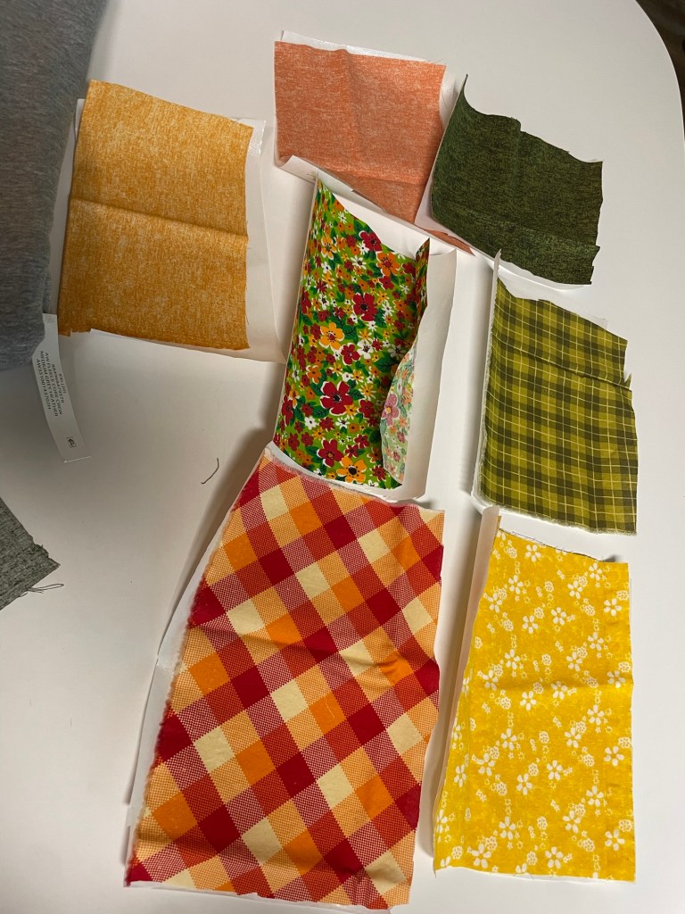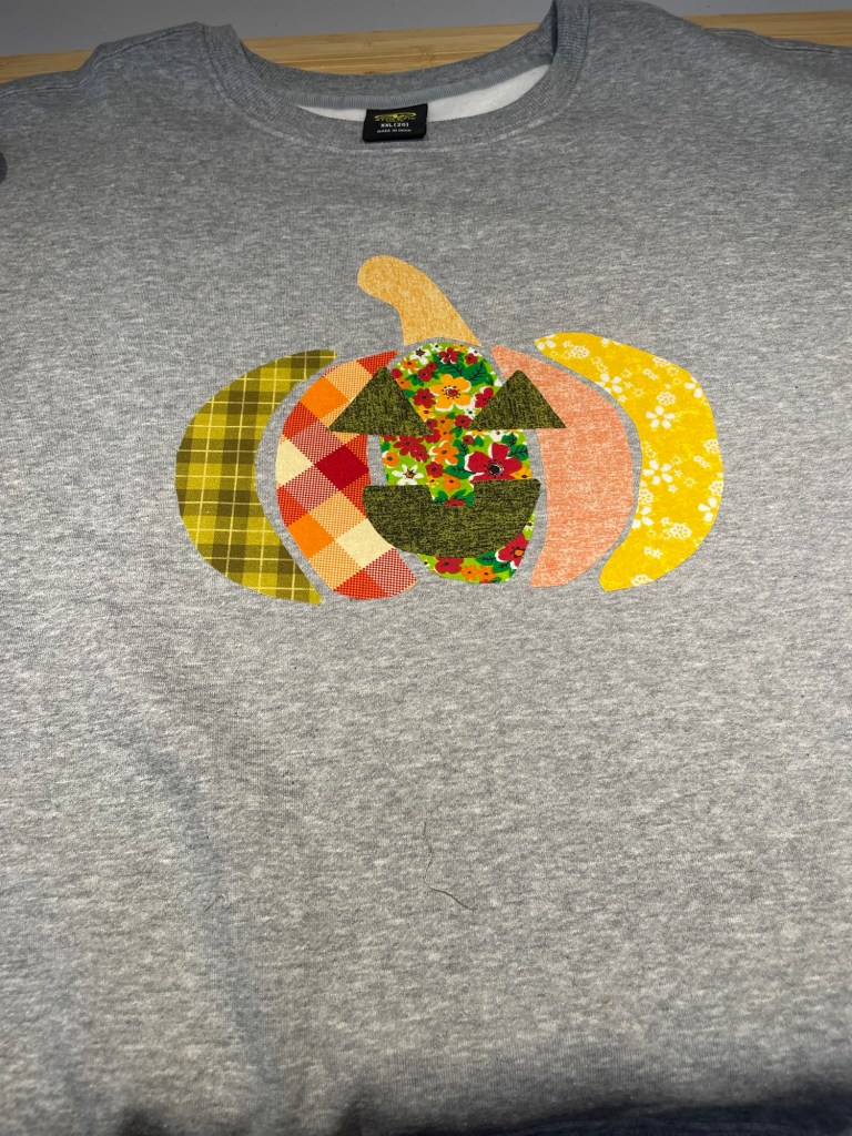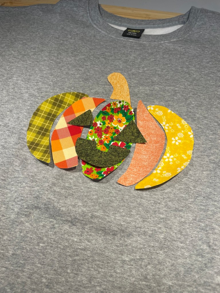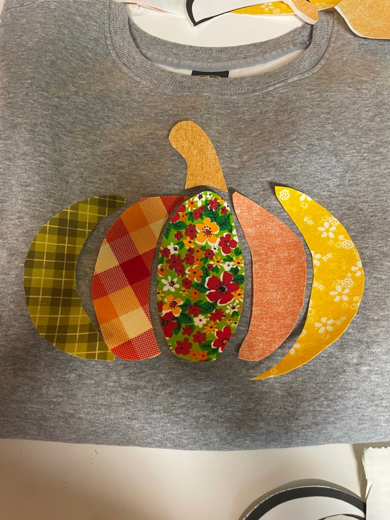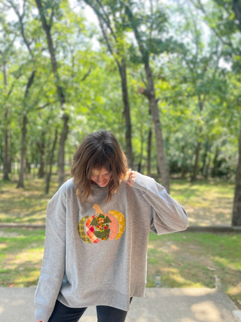 I belong to a “Buy Nothing” group on Facebook and was generously gifted a large amount of gorgeous brightly colored scrap fabric to begin my sewing journey but also worked great for my no-sew pumpkin sweatshirt design. If you want to do this project At little to no cost, be sure to ask around your social networks and friends and family for leftover fabric.