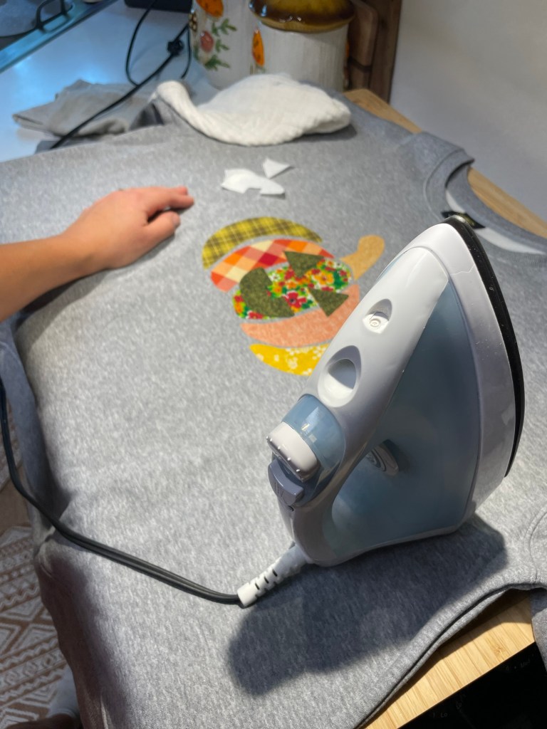 Once I ironed on my fabric pieces to build the most darling little pumpkin, I decided it also needed a jolly Jack-o-lantern face! Once the first layer of adhesive cooled, I ironed on the face last (which I dis freehand)!